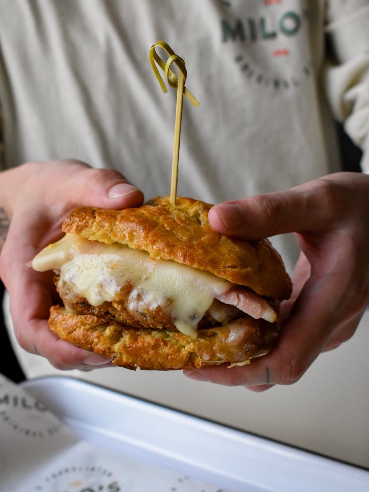 house-made biscuit, chicken cutlet, ham, Swiss cheese, dijonnaise & hot honey drizzle